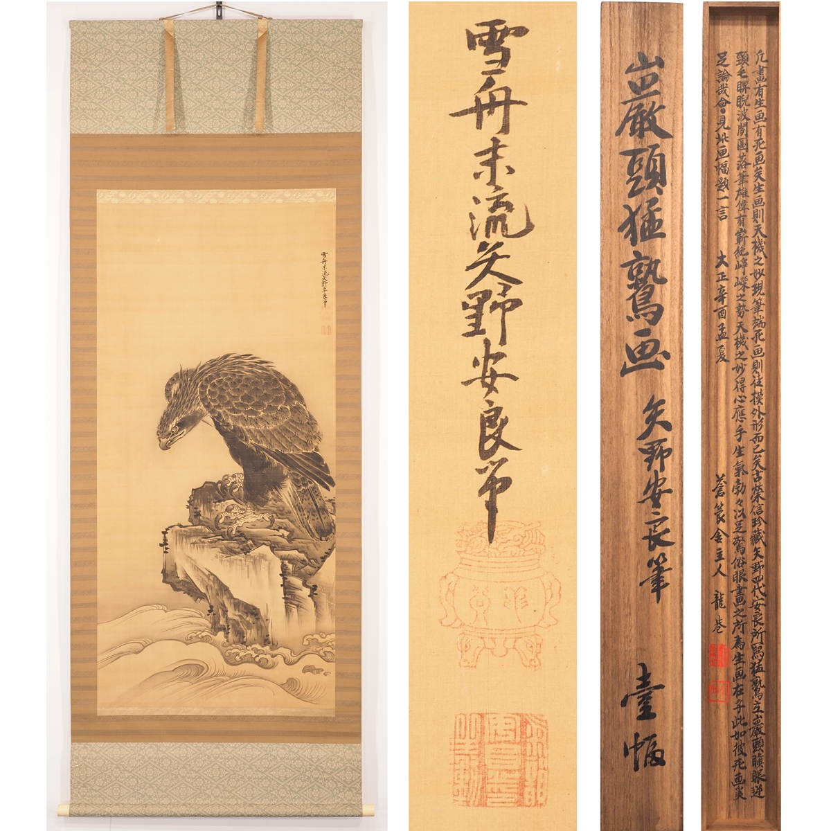 新入荷!矢野派の再興者、矢野雪叟の「巌頭猛鷲図」になります。矢野雪叟(1714-1777)正徳4年生まれ。山田里助の子。通称は喜三右衛門。安良と称した。号は龍谷、鶴仙斎、窓月、喫茶亭などがある。矢野家三代茂安に学び、のちに養子となって矢野家四代を継いで、藩画府根役となった。明和2年法橋に叙せら、雪叟に改号した。安永6年、64歳で死去した。https://yuagariart.com/uag/kumamoto03/
