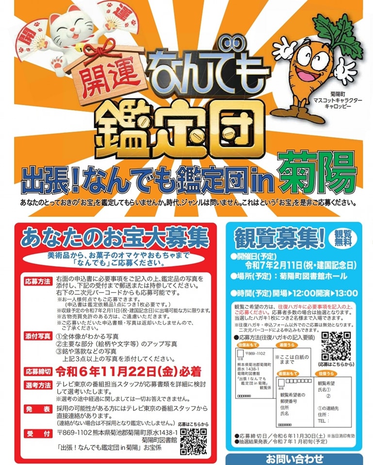 菊陽町に出張なんでも鑑定団がやって来ます。家に眠っているお宝を鑑定してもらいませんか?本物と鑑定していただいた商品は高く買取させていただきます。また当社の商品を購入してテレビに出演しませんか?#渡鹿庵 #掛軸 #絵画 #買取 #熊本 #菊陽町 #なんでも鑑定団 #出張